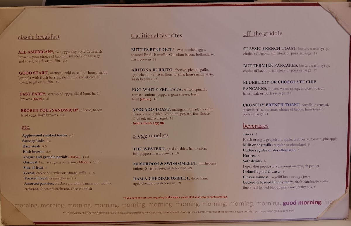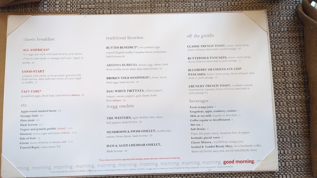 From a reviewer’s perspective, the menu at Market Cafe offers a well-rounded and approachable breakfast experience that balances classic comfort with regional flair. The Classic Breakfast section sets a familiar tone with dependable choices like All American*, Good Start, and Fast Fare*, ideal for guests who want a straightforward start to the day. Moving into Traditional Favorites, the menu becomes more distinctive with items such as Buttes Benedict*, Arizona Burrito, Broken Yolk Sandwich*, and Egg White Frittata, blending hearty flavors with lighter, health-conscious options. For egg lovers, the 3-Egg Omelets-including The Western, Mushroom & Swiss Omelet, and Ham & Aged Cheddar Omelet-highlight customization and generous portions. Sweet breakfast fans are equally satisfied by the Off the Griddle selections like Classic French Toast, Buttermilk Pancakes, Blueberry or Chocolate Chip Pancakes, and Crunchy French Toast, which add variety and indulgence. The supporting Etc menu, featuring Apple-Wood Smoked Bacon, Sausage Links, Ham Steak, Hash Browns, and Yogurt and Granola Parfait, rounds out the meal with flexible sides. Finally, a solid Beverages list-including Fresh Orange Juice, Grapefruit, Apple, Cranberry, Tomato, Milk or Soy Milk, Coffee Regular or Decaffeinated, and Hot Tea-ensures a complete and satisfying breakfast experience. Overall, the menu feels thoughtfully curated, consistent, and appealing to a wide range of tastes.